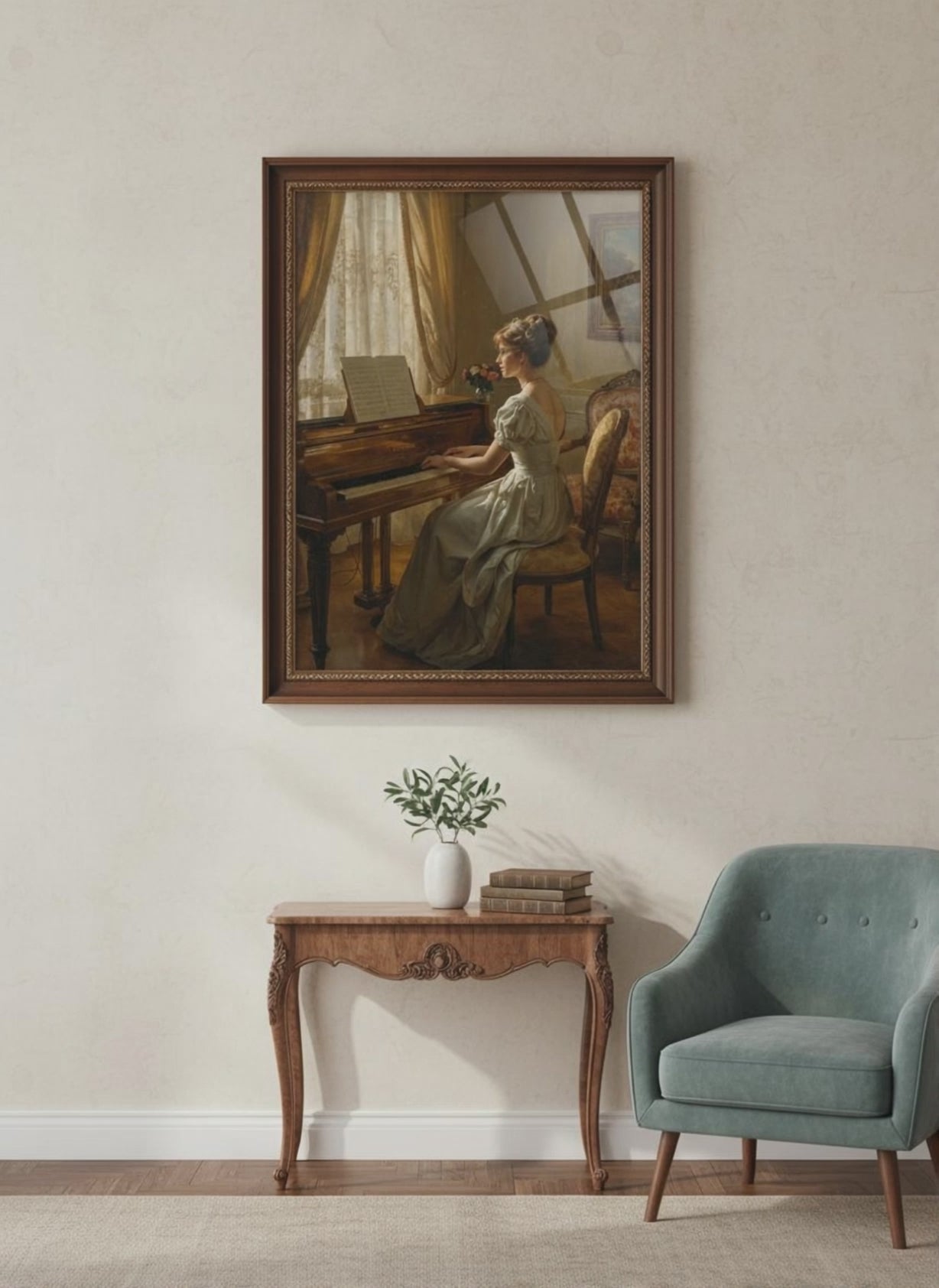 Discover the refined beauty of classical portrait art with this stunning vintage-inspired painting. A graceful woman in an elegant light green gown sits at a grand piano, captured in a moment of serene contemplation. Soft natural light filters through delicate lace curtains, illuminating the warm, intimate interior. Rich details throughout the scene—from the ornate furniture to the small vase of roses on the table—create an atmosphere of refined sophistication and timeless beauty.