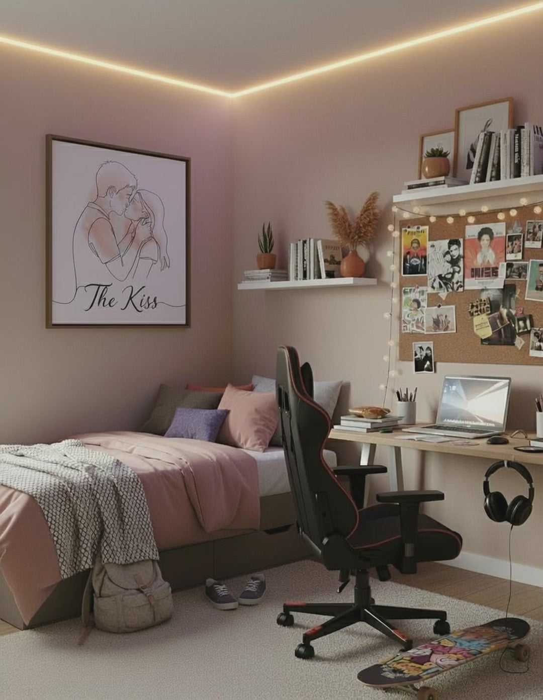 Celebrate the timeless beauty of love with this elegant minimalist line art portrait. Two figures share a tender kiss, their connection captured in delicate continuous line work enhanced by soft blush watercolor tones. The flowing, organic lines create an intimate composition that feels both contemporary and classic, radiating warmth and romance.